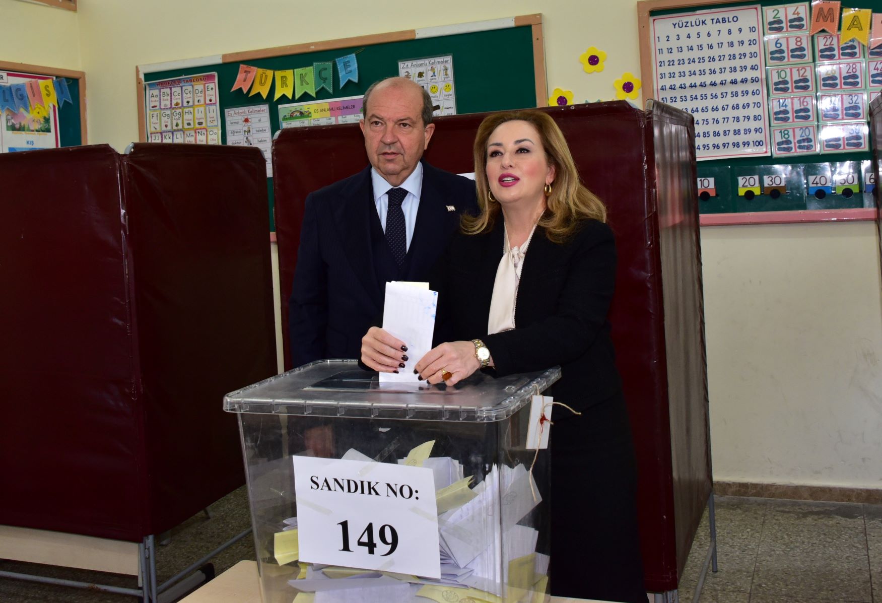 Cumhurbaşkanı Ersin Tatar eşi Sibel Tatar ile birlikte Şehit Tuncer İlkokulu’nda 149 numaralı sandıkta oyunu kullandı.
