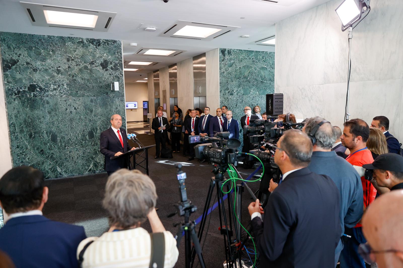 Cumhurbaşkanı Ersin Tatar, New York’taki temasları sonrası yaptığı açıklamada, görüşmelerin yapıcı bir ortamda geçtiğini ancak Rum tarafının tek taraflı adımları nedeniyle somut bir ilerleme kaydedilemediğini belirtti. Tatar, Cenevre’de başlayan olumlu atmosferin, Rum tarafının Kuzey’deki taşınmaz mallarla ilgili başlattığı ceza soruşturmalarıyla bozulmasından duyduğu hayal kırıklığını dile getirdi.