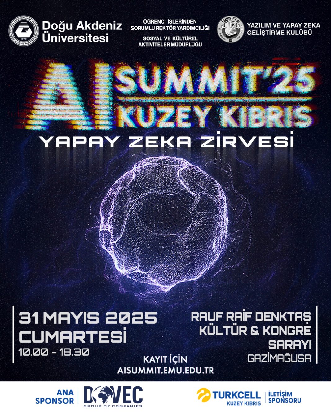 DAÜ’den yapılan açıklamaya göre, Doğu Akdeniz Üniversitesi (DAÜ) Öğrenci İşlerinden Sorumlu Rektör Yardımcılığı çatısında yer alan Sosyal ve Kültürel Aktiviteler Müdürlüğü ile Yazılım ve Yapay Zeka Kulübü iş birliğinde organize edilen zirve, 10.00-18.30 saatleri arasında Rauf Raif Denktaş Kültür ve Kongre Sarayı’nda yer alacak.