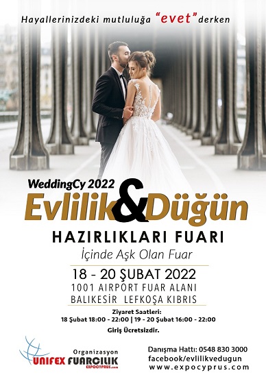 “Wedding Cyprus 2022” “10. Evlilik ve Düğün Hazırlıkları Fuarı”, 18 Şubat’ta Demirhan’daki 1001 Airport Mall & Fuar alanı açılıyor. Fuar, 18-20 Şubat tarihleri arasında ziyarete açık olacak.