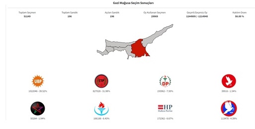 29 bin 969 seçmenin oy kullandığı Gazimağusa’da seçime katılım oranı yüzde yüzde 58.59 oldu. Geçerli oyların sayısı 1 milyuon 244 bin 909 olarak açıklandı.