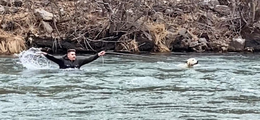 Yılmaz, hava sıcaklığının eksi 2 derece olduğu bölgede kar sularının erimesiyle debisi yükselen Munzur Çayı’na kıyafetlerini çıkarmadan atladı ve köpeği dondurucu sudan çıkardı.