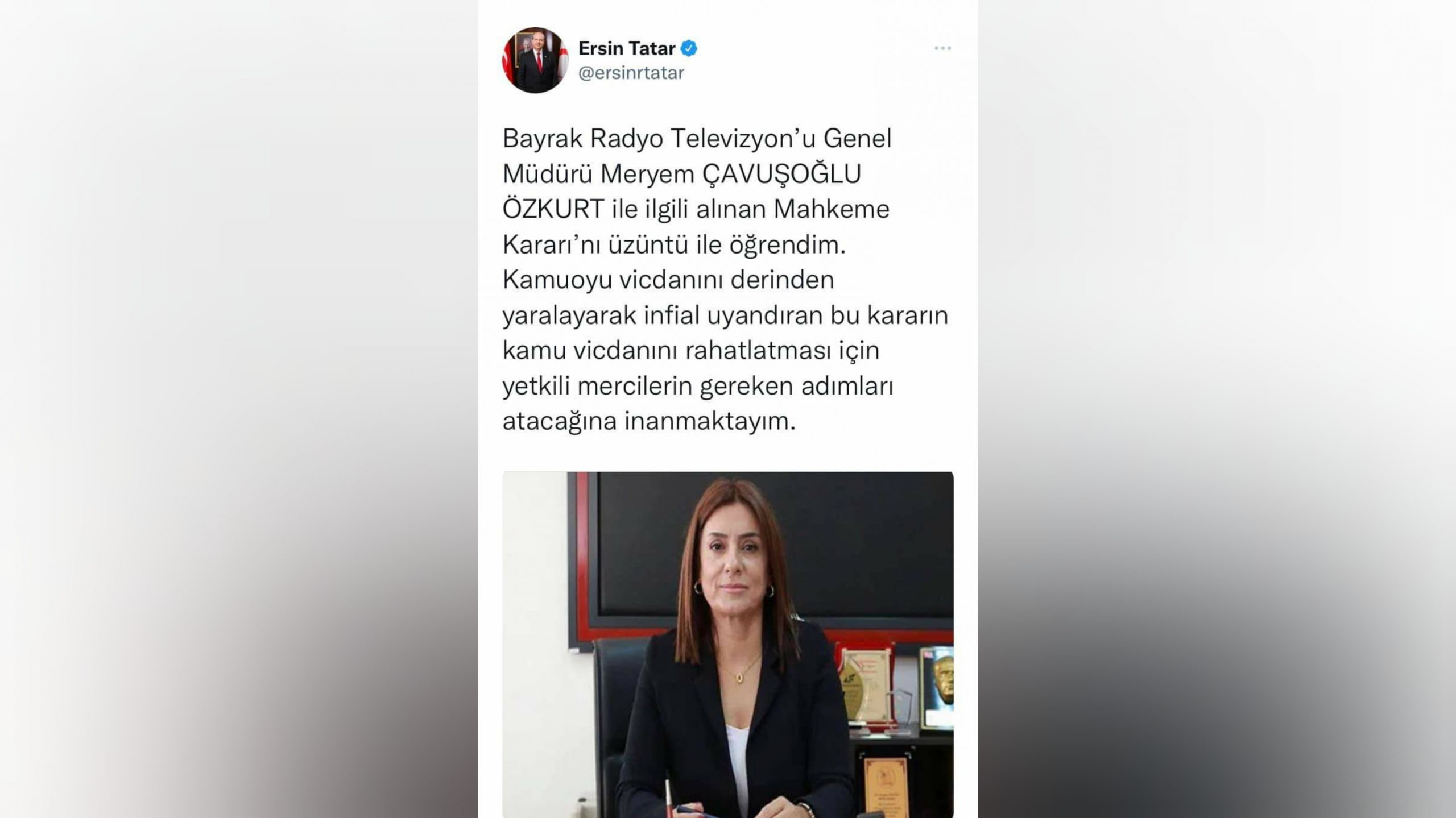 “Bayrak Radyo Televizyon Kurumu Genel Müdürü Sn. Meryem ÇAVUŞOĞLU ÖZKURT ile ilgili bugün alınan Mahkeme Kararı’nı büyük bir üzüntü ile öğrenmiş bulunmaktayım. Kamuoyu vicdanını derinde yaralayarak infial uyandırdığını gözlemlediğim bu konuda, kamu vicdanının rahatlatılması için yetkili mercilerin gereken adımları ivedilikle atacağına inanmaktayım”
