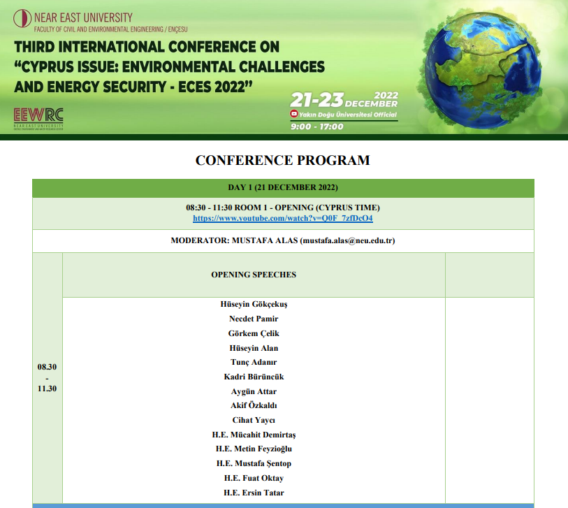 Bu yıl üçüncüsü gerçekleştirilen uluslararası konferansın açılış konuşmalarını KKTC Cumhurbaşkanı Ersin Tatar, Türkiye Cumhuriyeti Çevre ve Şehircilik Bakan Yardımcısı Mücahit Demirtaş, Türk Denizcilik ve Global Stratejiler Merkezi Başkanı Müstafi Tümamiral Doç. Dr. Cihat Yaycı, Tarım ve Orman Eski Bakan Yardımcısı Akif Özkaldı, Türkiye Azerbaycan Dostluk İşbirliği ve Dayanışma Vakfı Başkanı ve Türkiye Cumhurbaşkanlığı Güvenlik ve Dış Politikalar Kurulu Üyesi Prof. Dr. Aygün Attar, KKTC Bilgi Teknolojileri Haberleşme Kurumu Başkanı Kadri Bürüncük, Kıbrıs Türk Mühendis ve Mimar Odaları Birliği Genel Başkan Tunç Adanır, Türkiye Jeoloji Mühendisleri Odası Başkanı Hüseyin Alan, Kıbrıs Türk Enerji Verimliliği Derneği Başkanı Görkem Çelik, Enerji Politikaları Uzmanı Necdet Pamir ve Yakın Doğu Üniversitesi İnşaat ve Çevre Mühendisliği Fakültesi Dekanı Prof. Dr. Hüseyin Gökçekuş yaptı. Konferansın kapanış konuşmasını ise aynı zamanda Türk Dünyası Mühendisler ve Mimarlar Birliği Onursal Başkanı ve Türk Devletleri Teşkilatı (TDT) Aksakallılar Heyeti Başkanı da olan AK Parti Genel Başkan Vekili Binali Yıldırım yapacak.